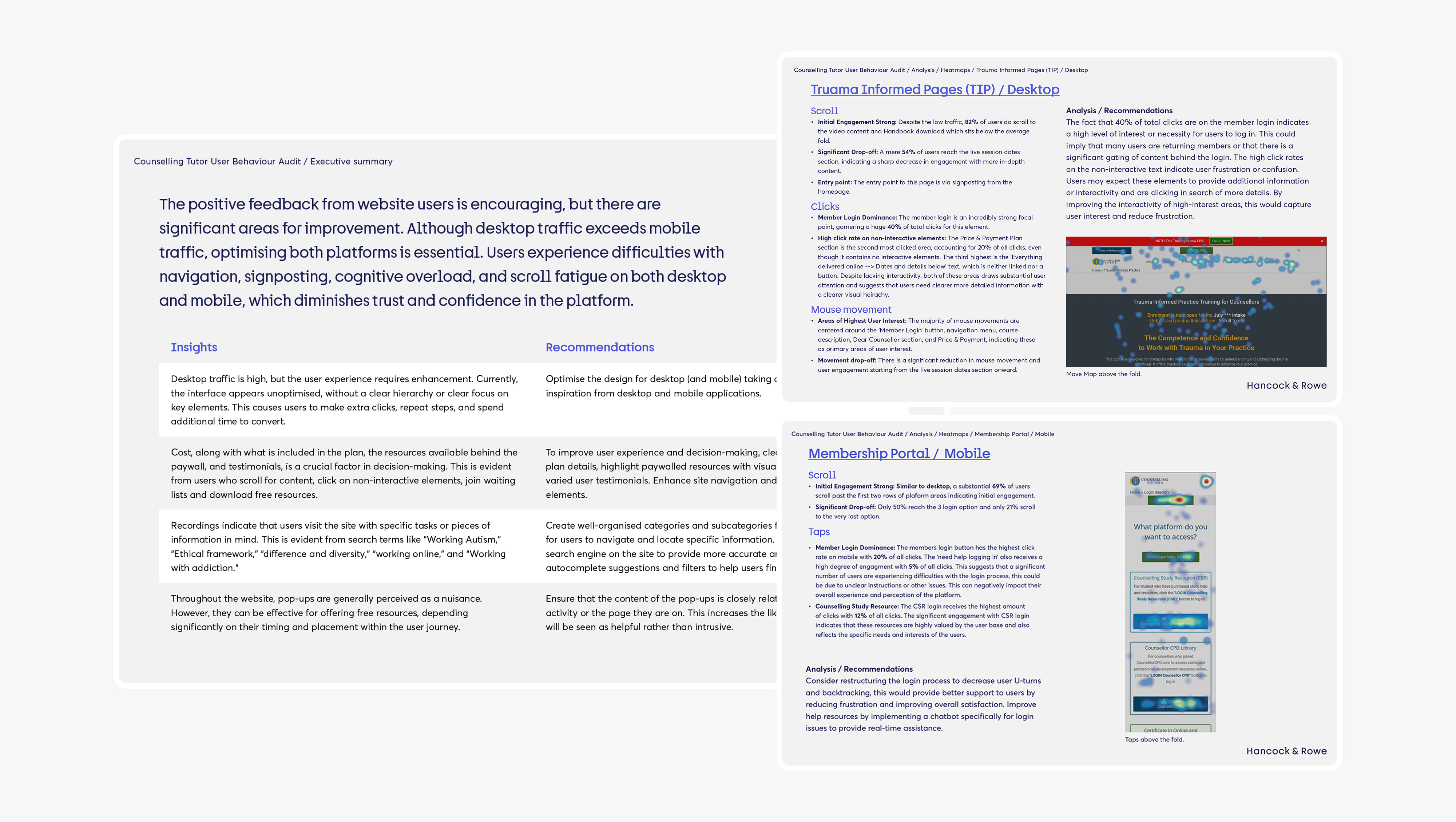 From this data, I generated clear, actionable insights – pinpointing usability barriers, content blind spots, and navigation friction that were invisible from analytics alone. I then translated these findings into practical design recommendations that gave Hancock and Rowe’s team a confident, evidence based starting point for restructuring and redesigning the site.